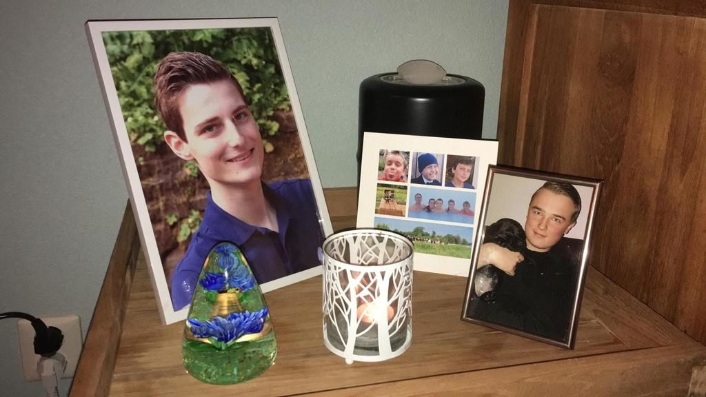 Daar staan ze: drie mooie, slimme jongens met hun lootjes uit de verkeerde loterij … Niels, Joshua en Kester in de ‘eregalerij’ bij Niels thuis. Voor altijd met elkaar verbonden door een zeldzame naargeestige gebeurtenis.