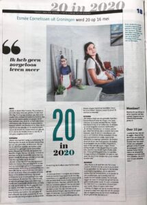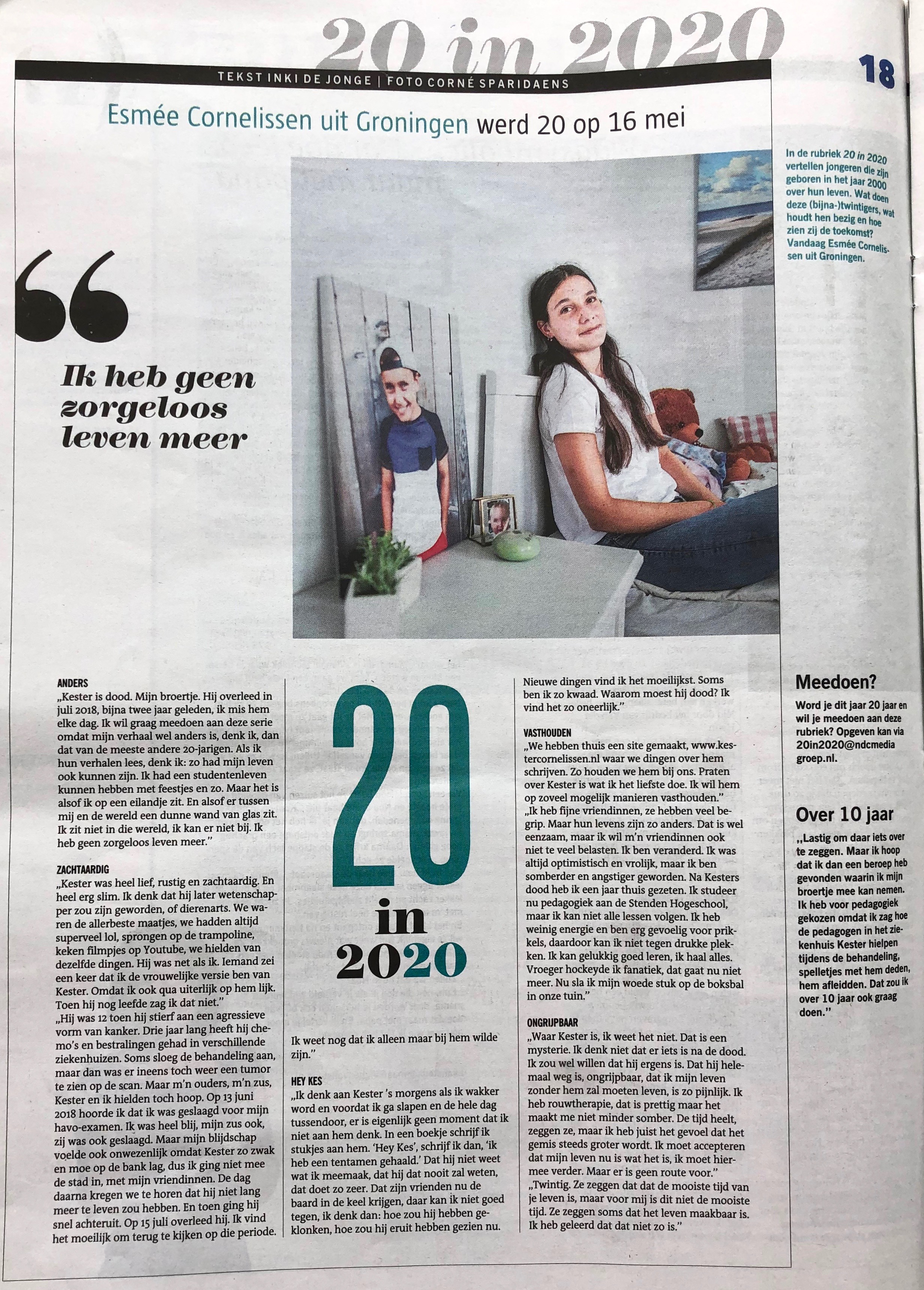In het Dagblad van het Noorden van dit weekend vertelt Esmée over haar ongewone leven en het gemis van Kester. Ze doet dit in de rubriek ‘20 in 2020’ , waarin (bijna)-20 jarigen kunnen vertellen over hun leven. Esmée heeft zich opgegeven omdat ze graag over Kester wil vertellen, en laten zien dat ze een ander leven heeft dan de meeste 20-jarigen. Ook wilde ze duidelijk maken dat het verlies van Kester nog steeds impact heeft. Eerder schreef Vivienne, geïnspireerd door deze rubriek, voor haar studie ook al een stukje hierover.