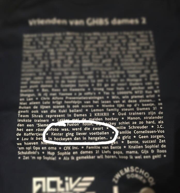Familie en vrienden van het hockeyteam van Vivienne en Esmée konden, als sponsor, zinnetjes aanleveren voor op de hockeytrui. Natuurlijk moest Kester ook op de trui. Maar Kester was niet echt een hockeyliefhebber. Daarom staat er nu: “Kester ging liever voetballen”.