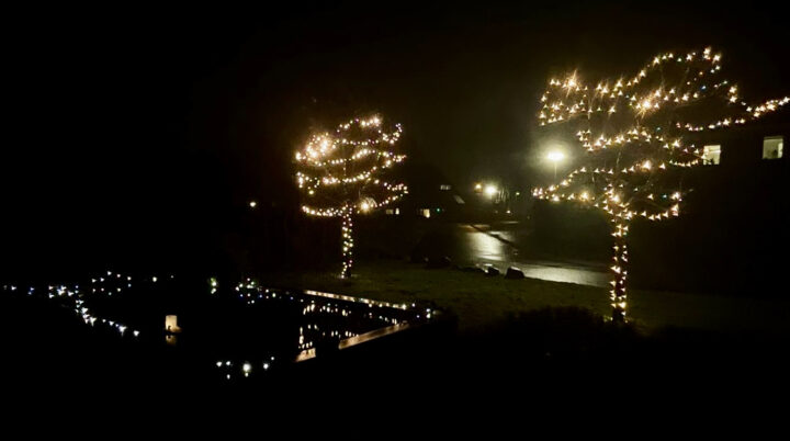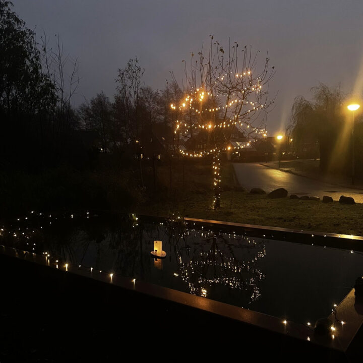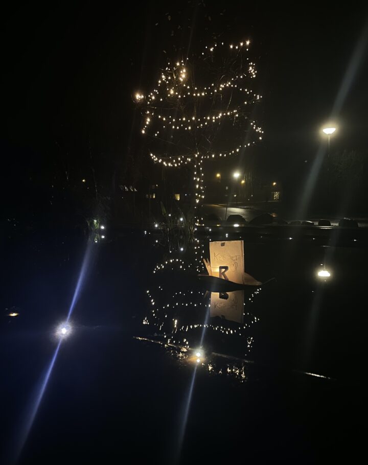 Maar, niet getreurd (niet daarom althans). We hebben immers een eigen vijver voor ons huis, en ook het bootje met een fotootje van Kester aan het roer achterop, hadden we nog. Dat werd dus nogmaals te water gelaten. Met lichtjes in onze appelbomen en rondom de vijver werd het een bijzonder gezicht.