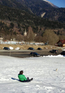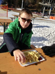 In februari 2017 konden we tussen twee chemokuren door een weekje naar Oostenrijk. Kester was snel moe, maar genoot niettemin met volle teugen van het met een sleetje de helling af glijden. En natuurlijk van een bordje friet als après-slee.