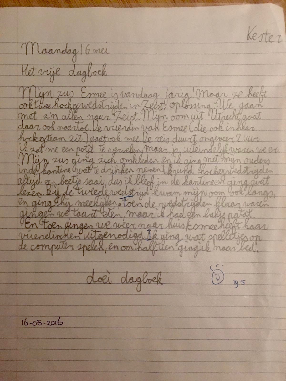 Op 16 mei 2016 werd Esmée 16. Die dag had ze een hockeytoernooi. Voor school moest Kester een verhaaltje schrijven in dagboekvorm. Daarin vertelde hij over de verjaardag van zijn zus: